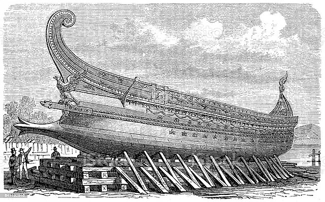 Roman ships such as the trireme and quinquereme were designed for war and control, emphasizing speed and maneuverability for ramming and boarding enemy vessels. Built with mortise-and-tenon joints and iron nails, often from oak or pine, they were rigid and heavy —suitable for the calm, enclosed waters of the Mediterranean but unsuited for the unpredictable open seas.
